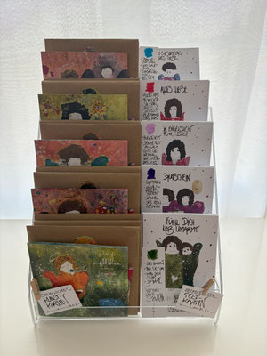 Die herzhaft eingepackten Seelenlichter-Karten lassen sich auch gut verteilt, - jeweils mit passender Musterkarte zum Anschauen - im Raum mit anderen Geschenkeartikel oder Blumen präsentieren. Für unsere  Herzensgrüsse-Postkarten stellen wir Tüten zum Einpacken bereit.